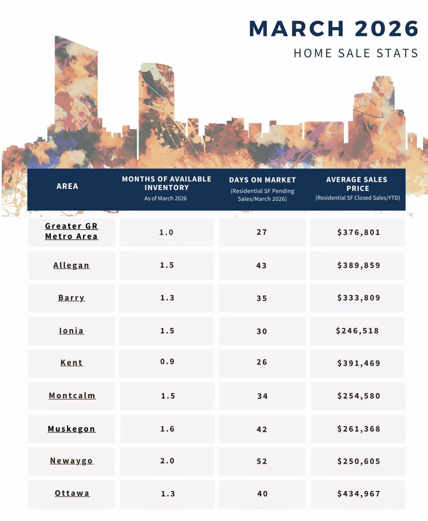 The March data continues to reflect a few key trends shaping the West Michigan market. Inventory remains extremely low, which is driving competition among buyers. Homes are selling faster than we have seen in previous months, and prices continue to trend upward.